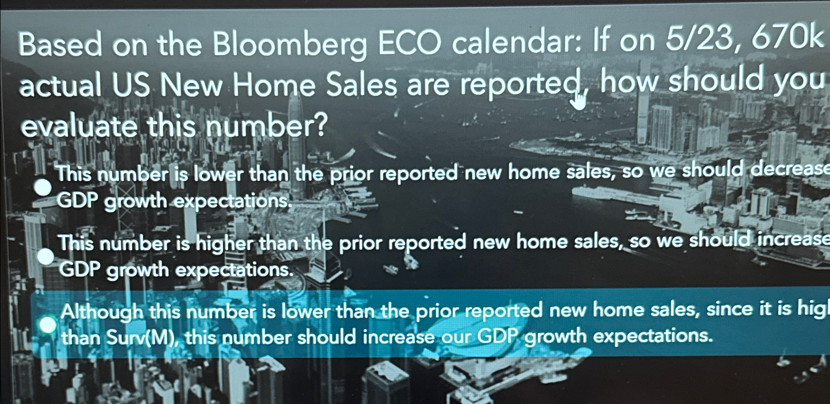 If on 5/23, 670k actual us new home sales are reported, how should you evaluate this number? Based on the bloomberg eco calendar: Which description most accurately reflects the history and forecast of us net exports, based on the actual and forecast data in the ecfc. To assess the given figure from the economic schedule, you would compare it to the standard benchmark for.