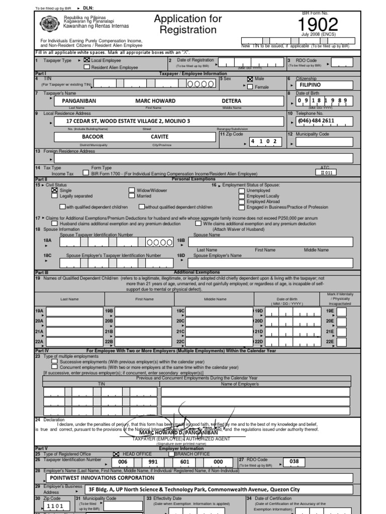 Republic of the philippines department of finance 3 taxpayer identification number (tin) (for taxpayer with existing tin) bir form no. Bir form 1902 is designed for individuals who are registering as employees.