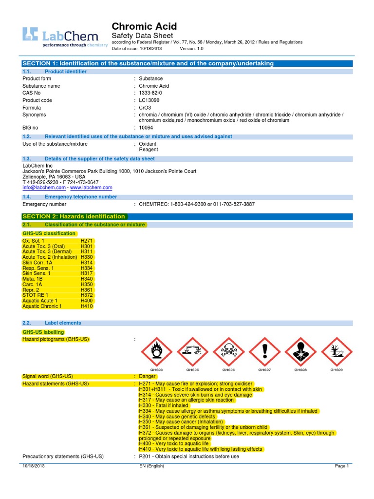 Chromic acid, 10% w/v safety data sheet according to federal register / vol. Show this material safety data sheet to the doctor in attendance. Exposure to 15 mg/m3 (as hexavalent chromium) is immediately dangerous to life and health. Chromic acid safety data sheet according to federal register / vol. For the full text of the hazard and precautionary statements listed below, see section 16. First aiders need to protect themselves. 58 / monday, march 26, 2012 / rules and regulations Ution to avoid mixing wit. If the possibility of exposure above 15 mg/m 3. 58 / monday, march 26, 2012 / rules and regulations