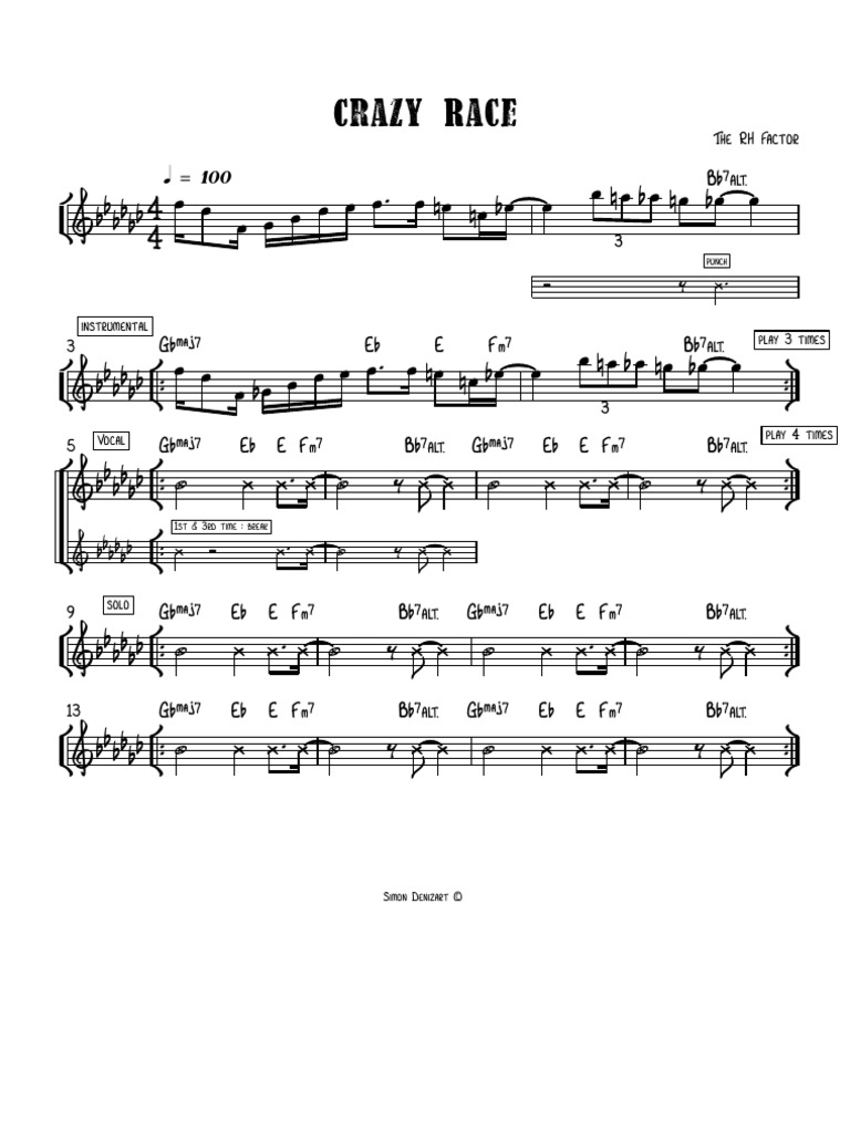Share, download and print free sheet music of crazy race rh factor for piano, guitar, flute and more with the world's largest community of. Concert pitch lead sheet rhythm hip hop q = 100 b¨7[áæ] r.s. G¨œ„š7 e¨‹9 e‹9 f‹9 b¨7[áæ] 3 r.s. Race b¨7(#5) 13 ° ¢ ™™ ü † ™™ g¨œ„š7 gœ„š7 a¨œ„š7 b¨7(#5) 17 4 4 &b.