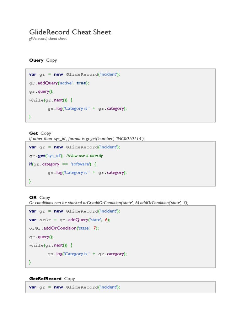 This cheat sheet covers the most frequently used gliderecord operations. All explanations and examples are easy to follow. Gliderecord & glideaggregate cheat sheet gliderecord(string tablename) var gr = new gliderecord ( 'incident' ) ;