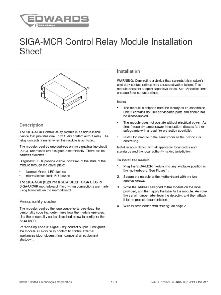 387358PEN R007 SIGAMCR Control Relay Module Installation Sheet PDF