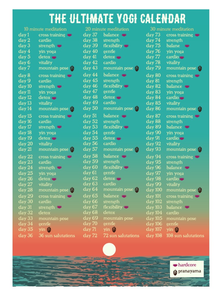 The ultimate yogi 108 day calendar [6klzgg12yqng]. The ultimate yogi calendar 10 minute meditation day 1 cross training day 2 cardio day 3 strength.
